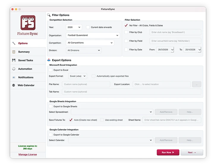 Choose where you want your fixtures to go. Toggle on Excel, CSV, Google Calendar, Google Sheets, or any combination. Set file paths, file names, tab names or specific Sheets and Calendars.
